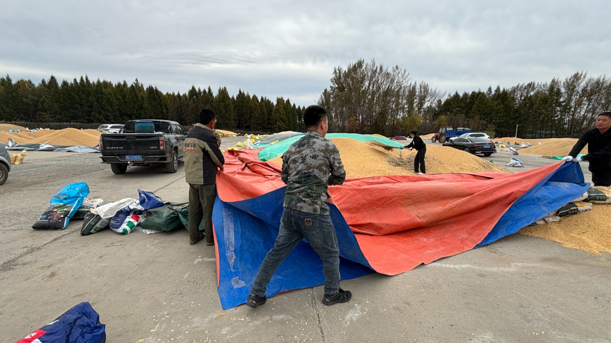 在护粮一线,八五六公司以“全链条防护”为抓手,结合近期阴雨气候,辅导栽培户将暴晒的粮食快速收拢粮堆,掩盖防水篷布并压实边际,谨防雨雪进入;结合露天储粮点特性,及时分配苫布、沙袋等物资,防止粮食非直接触摸湿润环境。一起,管理人员实时监测粮堆温度、水分改变,对局部发热粮堆第一时间采纳翻倒、通风等办法,从源头阻断霉变危险。